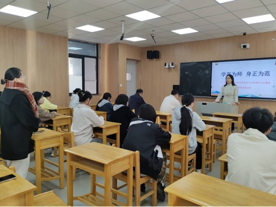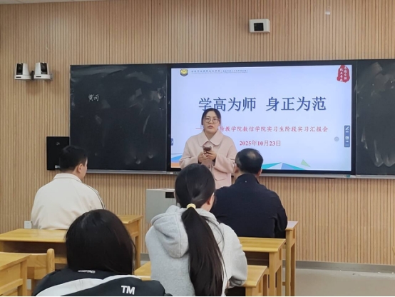 调研期间,学院老师深入实习生日常办公的地点并且进行了检查,随后召集实习生开展了以“学高为师,身正为范”为主题的实习报告会。报告会上徐宁副校长对于颜超副院长一行的到访表示热烈欢迎。随后陈婷主任介绍了实习生的基本情况以及实习工作开展成果。她表示实习生整体表现让教学处倍感欣慰。在校期间,大家严格遵守学校规章制度,主动融入师生集体,积极参与教研活动,快速适应教学节奏,初步展现了展现出教育工作者的责任与潜力。