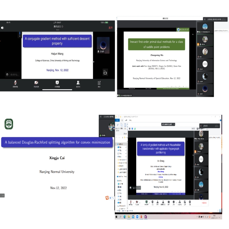 蔡邢菊教授开展了题目为“A balanced Douglas-Rachford splitting algorithm for convex minimization”的学术报告。她介绍了Douglas-Rachford算法,该算法是解决包含问题的一种经典有效的分割方法。最近,针对单调包含提出了一种自适应Douglas-Rachford分裂算法,该算法允许一个算子是弱单调的。将自适应Douglas-Rachford分裂方法(ADRSM)的思想应用于具有抽象约束的可微凸优化问题,得到了更有吸引力的结果。在数值实验中,将算法与其他常用算法进行了比较,验证了算法的有效性。