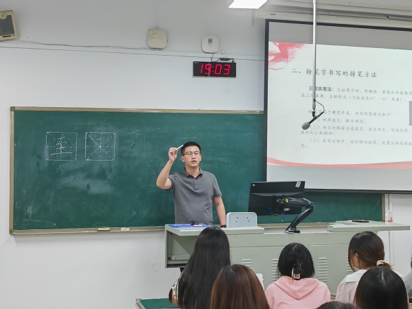 本次比赛邀请了美术与设计学院的老师为同学们进行赛前培训。老师们以生活中的案例为切入点,生动地讲解了中国书法史和字形演变的历史,展示了文房四宝的使用和名师大家楷书核心笔法的运用,解释了硬笔字和粉笔字的异同,并示范了不同类型汉字的书写方式。赛前培训让同学们领悟到了汉字的魅力,激发了同学们参加比赛的热情。