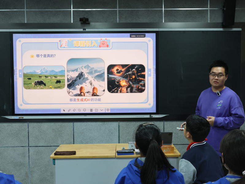 在南京市华电中学的精心安排下同学们开始了今天的见习观摩学习活动。首先同学们走进生成式AI主题课堂,观摩了“初识生成式 AI”的教学全过程。授课教师以生动通俗的语言,从生成式AI的基本概念、核心特性入手,逐步引导学生了解其在生活与学习中的应用场景。