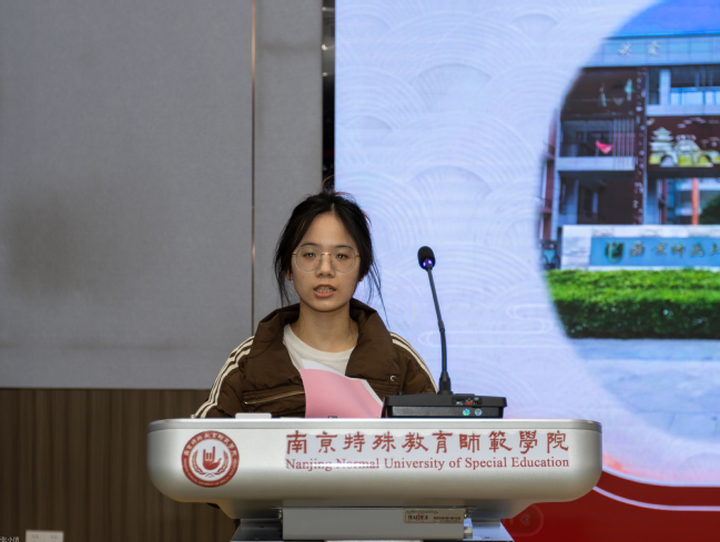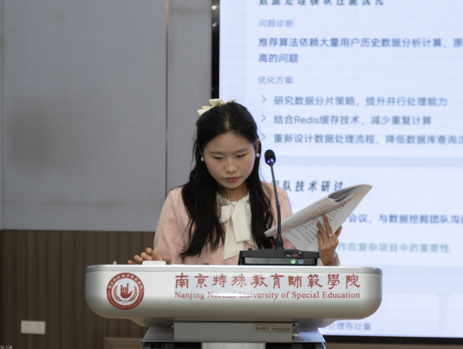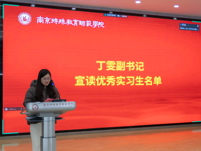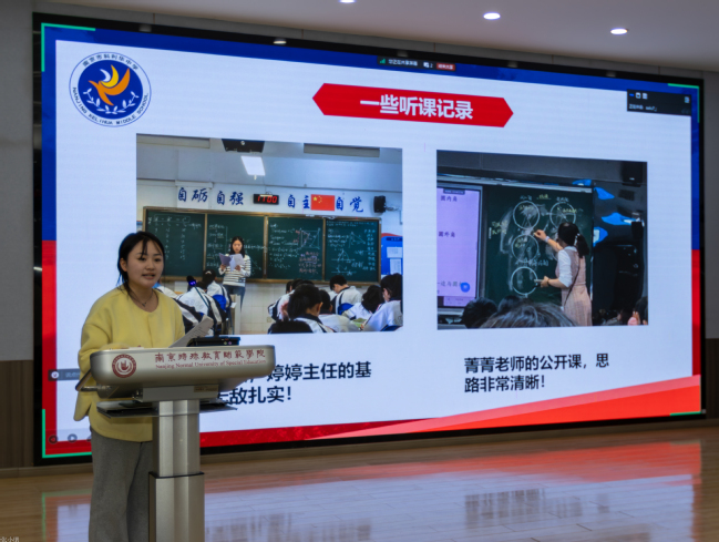 随后,优秀实习生代表依次上台分享实习心得。教育技术学专业胡江扬、数据科学与大数据技术专业李媛、数学与应用数学专业黄超玲、陆仪芸四位同学结合各自在不同岗位的实践经历,生动讲述了将理论知识应用于实际工作的体会与成长,表达了对学校培养和导师指导的感激之情。