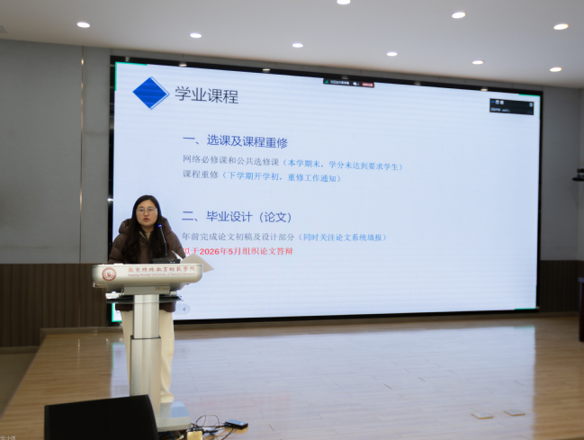 会议分为实习总结表彰与就业动员指导两个阶段进行。在实习总结环节,人工智能学院副院长於晓庆就本学院学生的实习情况作了全面总结,充分肯定了同学们在实习期间展现的专业素养与实践能力,并对实习单位的大力支持表示感谢。